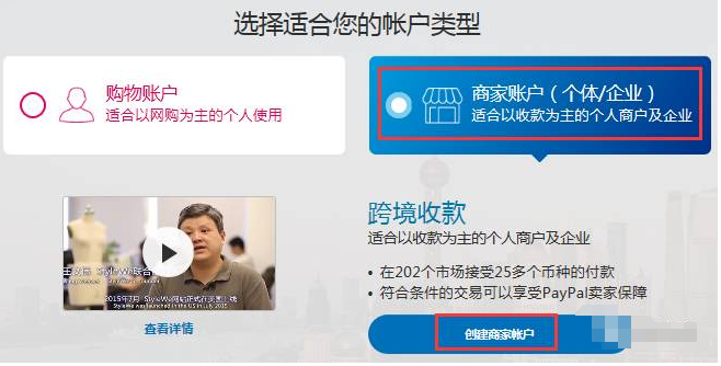 无论您是以个体或是企业的名义经营,都请选择‘商家账户’,然后点击‘创建商家账户’