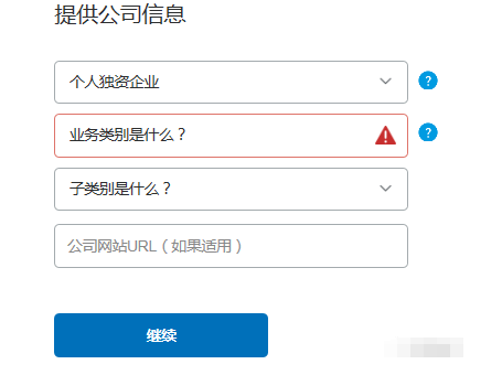 举个例子:假如你是独资企业,需要完善以下内容,然后点击继续。