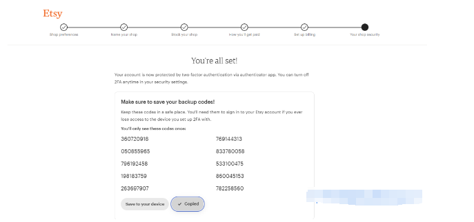 提示:这里出现的十组二次验证的验证码一定要保存好,否则因二次验证无法登陆店铺造成不必要的损失。