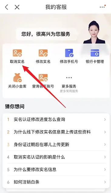 5、 进入到我的客服界面,点击“取消实名”。