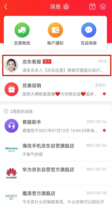 2、在消息界面点击京东客服。