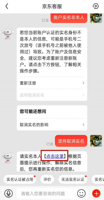 3、在对话页面输入取消实名认证后,选择账户实名非本人后,选择坚持取消实名后,进入实名解除页面。